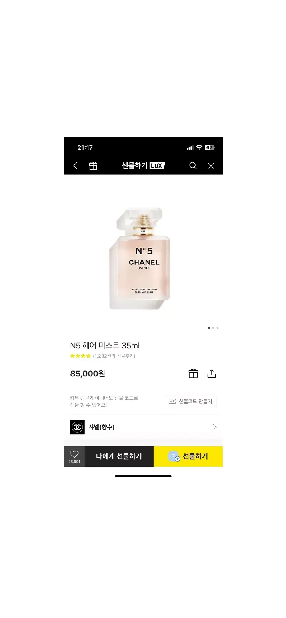 샤넬 N5 헤어미스트 새상품 입니다 선물 받았는데 같은 제품이 있어 새상품 내놓습니다 스티커도 떼지 않은 상태입니다! (선물가능상태) 쇼핑백은 없고 사진에 보이는 형태로 포장되어 있어요 정가 8.5 판매가격 택포 7
