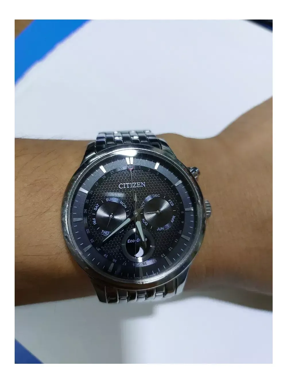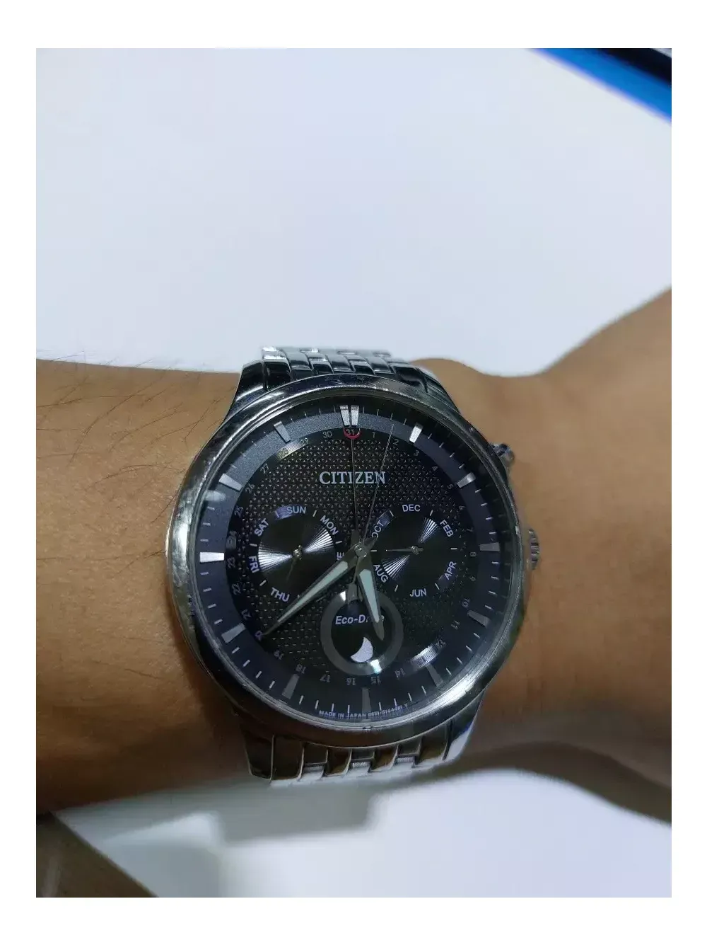 시티즌 문페이즈 검판 에코드라이브 모든 빛으로 충전됩니다. 밴드길이 대략 17.5~18cm정도. 유리 깨끗함. 밴드 생활기스있음. 시계단품. 작동 정상.