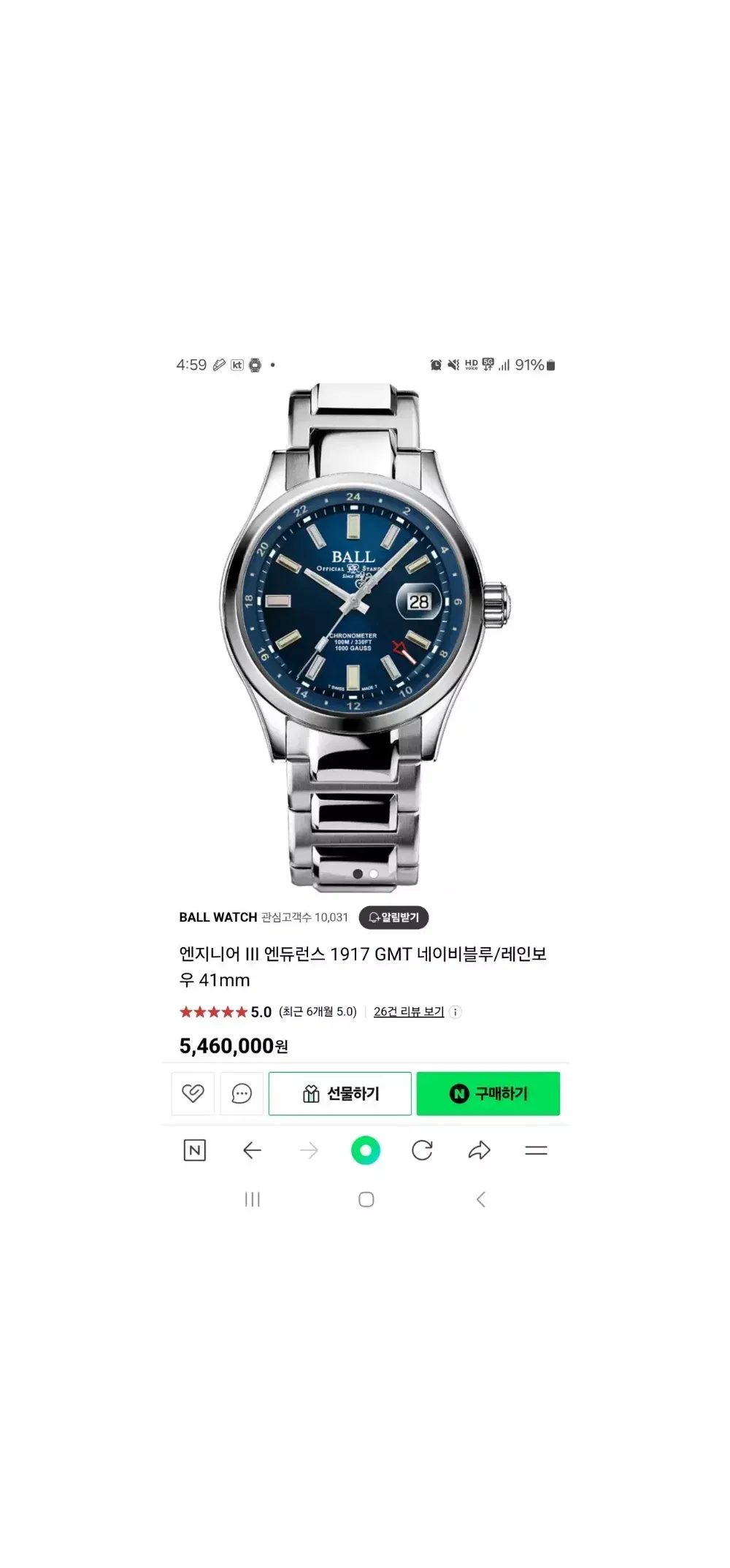 구입시기 : 2023. 05 시계명 : 볼워치 엔지니어 III 엔듀런스 GMT (한정판) 무브먼트 : 오토매틱, 42시간 파워리저브, GMT 기능 다이얼색상 : 블루 6개 색상의 야광 기능 트리튬 튜브 탑재 (축광 필요없음) 스틸 브레이슬릿 (현재 별도 구매한 가죽밴드 연결 중) 박스, 워런티카드 등 구성품 그대로 보유 중입니다. 구매 시 가죽줄도 드립니다. 시계 뒷면에 한정판 번호있습니다. 일상용으로 착용하지 않아 착용 횟수는 얼마되지 않습니다. 미세 스크래치가가 살짝 있으나 찍힘 없고 상태 아주 좋습니다. 24년 3월에 QC문제로 무브먼트 무상 교체해서 무브먼트 상태 자체는 거의 신품입니다. 관련 서류 보유 중입니다.